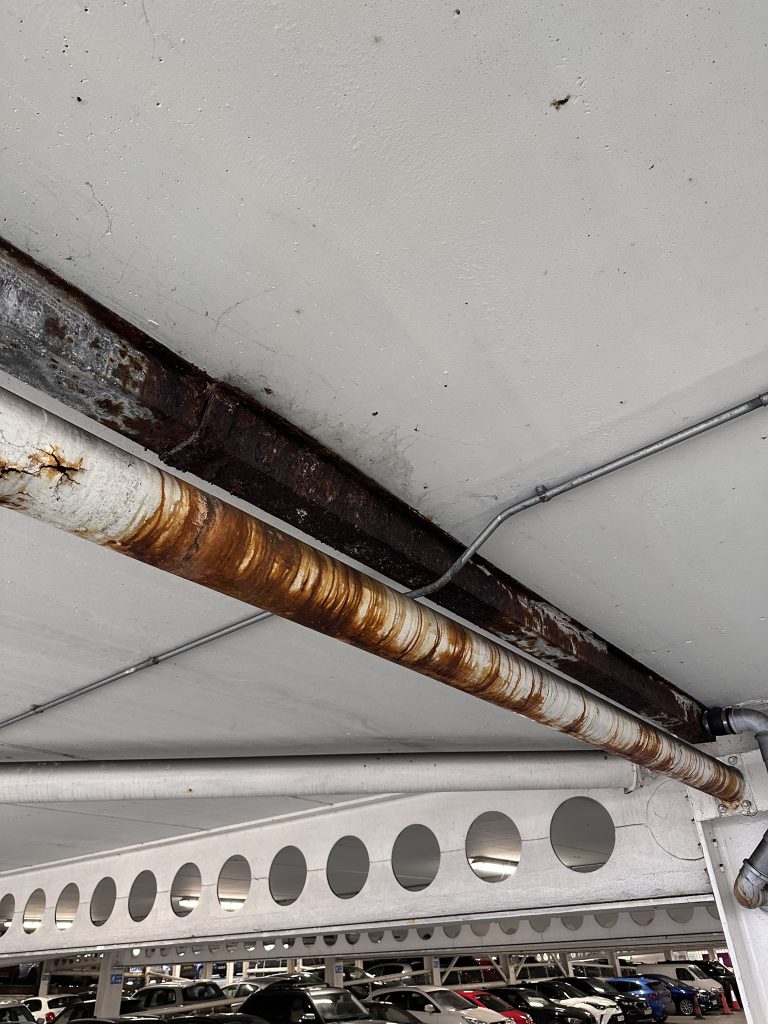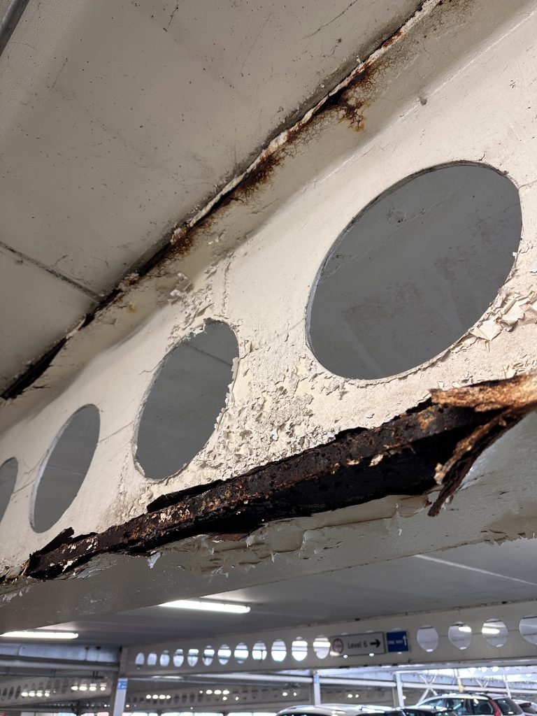 Early inspection is essential in environments like public car parks. A detailed survey allows the extent of coating failure to be mapped and understood before deterioration becomes critical. It helps determine which areas need full removal of failing coatings and which may be suitable for localised repair, as well as identifying the right preparation methods and coating system for long-term durability. Simply applying new paint without addressing corrosion and preparation rarely solves the problem and often leads to more failure.