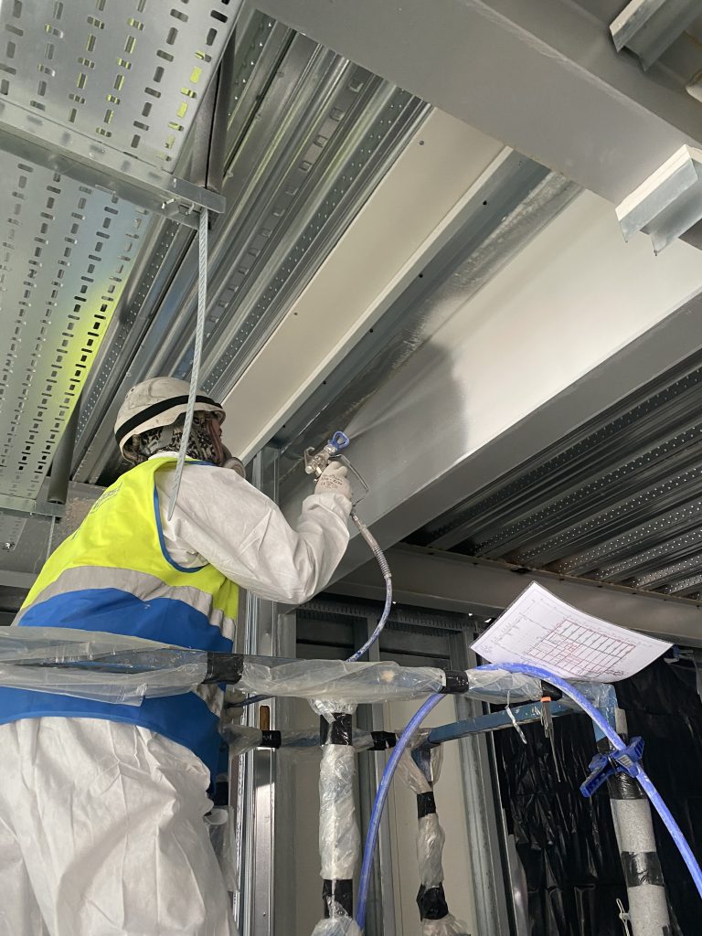 We focused on the paint application – the crucial finishing stage that provides both fire protection and a high-quality aesthetic finish. The finish was applied to meet the project’s fire safety specifications and achieve a consistent, durable look throughout.