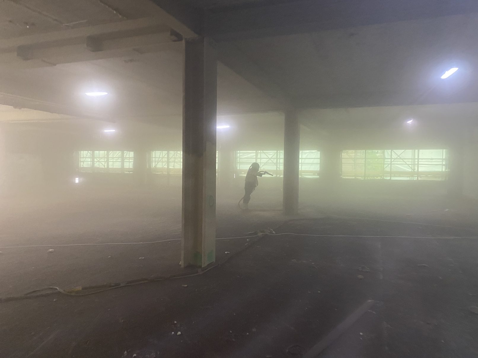 To enable the most efficient method of working each floor is split into two general sections that would take around a week to complete. To successfully Dry Blast these areas in this time three large Diesel compressors were set up in the loading bay area with airline routed to the level being blasted. This allowed for the inevitable breakdown when running machines at a high output. GenAir are always on hand to sort out problems or even swap out compressors if they fail.